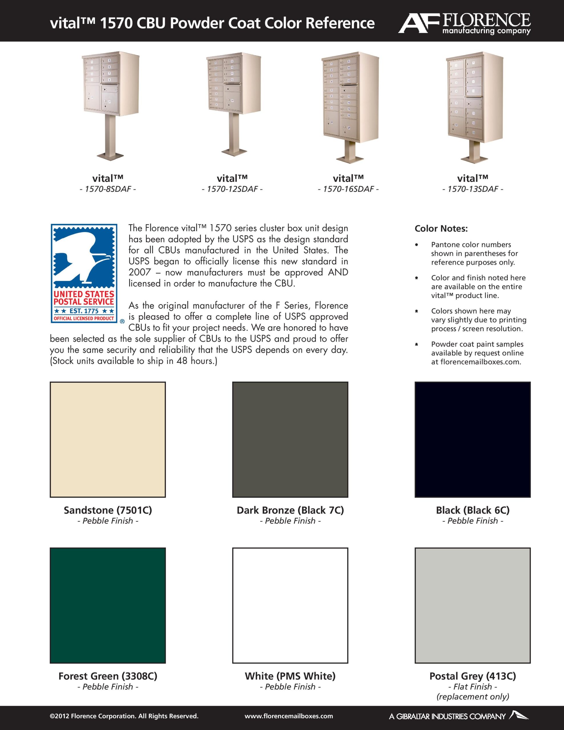 AuthFlorence USPS Approved CBU w/pedestal is the perfect solution for your centralized mail delivery needs. As the original manufacturer of the original F series CBU, our 1570 Cluster box design has been adopted by the USPS as the design standard for all CBU’s manufactured in the US. Florence is proud to offer you the same security and reliability we are honored to supply to the US Postal Service as their sole supplier of CBU’s. Florence CBU mailbox and pedestal (included in each mailbox purchase) provides a secure, free standing outdoor installation for your centralized mail delivery needs.
